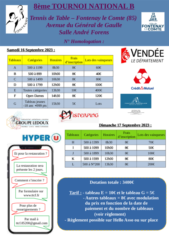 Le club de Fontenay Le Comte organise son tournoi national B les 16 et 17 septembre 2023 à la salle de la grande prairie à Fontenay le Comte, veuillez trouver ci-dessous le lien pour l'inscription :